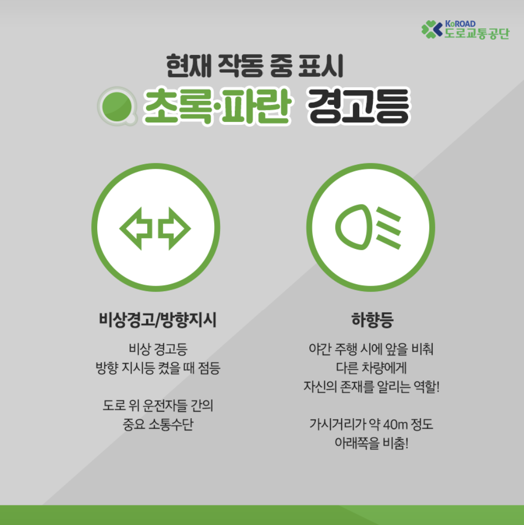 초록 파랑 : 양호 신호입니다. 현재 작동하고 있는 기능을 알려주는 상태표시입니다.