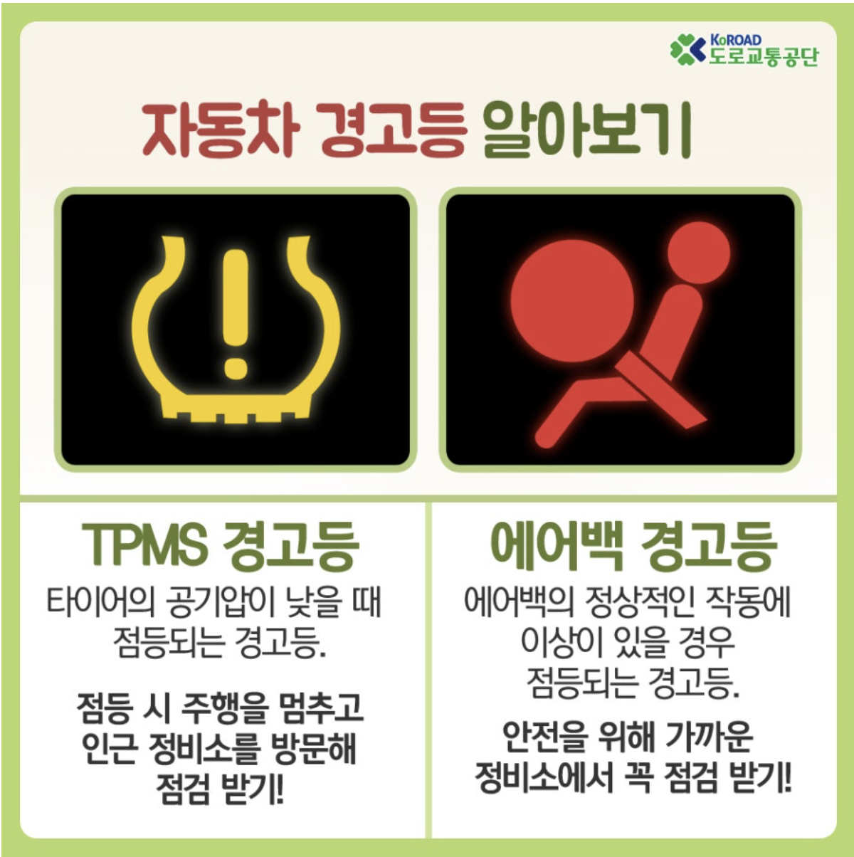 타이어의 공기압이 너무 낮으면 타이어 손상이나 파열 위험이 증가하므로, 경고등이 켜지면 즉시 타이어 공기압을 확인하고 필요한 경우 공기를 추가해야 합니다.
