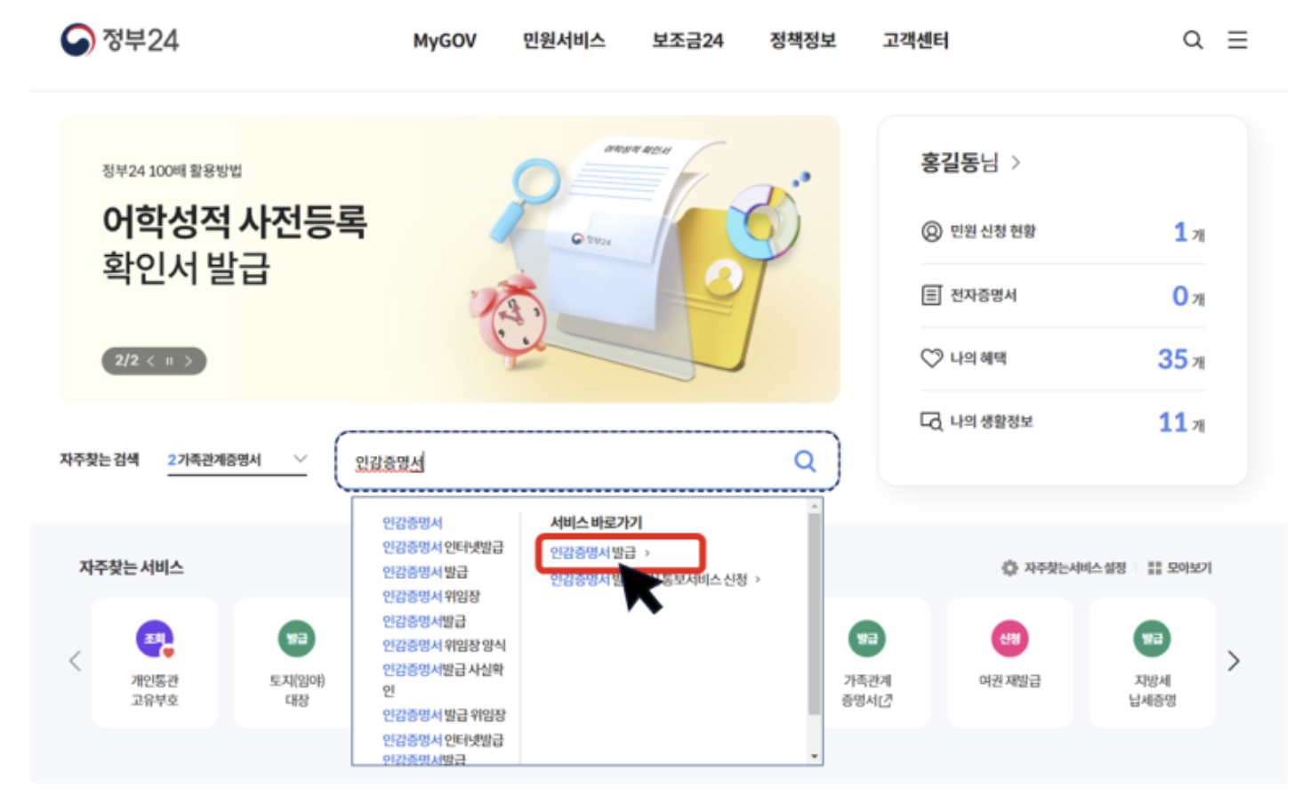 | 정부24 인증서 로그인▶ | 서비스 선택▶ | 개인정보 활용 및 동의▶ | 신청인 정보조회▶ | 증명서 발급확인 및 출력 |